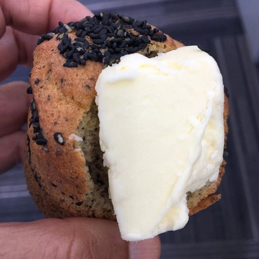 昼:前日と同じ黒ごま大豆粉マフィンですが、久しぶりにバターを思いっ切りトッピング