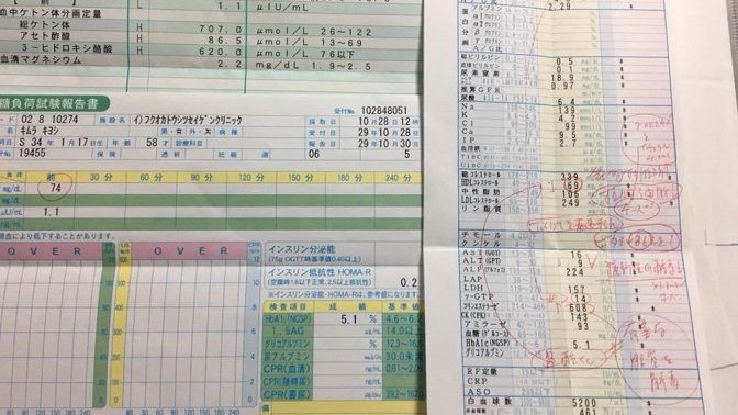 10月の検診結果が先生のコメント付きで送られて来ましたクール。H bA1c5.1%、血糖値74mg/dl、総ケトン体707μmol/ℓ、総コレステロール339mg/dl、中性脂肪106mg/dl…インスリン使用量を1日3単位に減らした後も特に大きな変化はありません