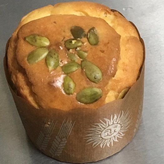 生地にカボチャの種を練り込んで、さらにトッピングして焼き上げた​ 大豆粉マフィン ​です。パンプキンシードの食感が楽しい​ 低糖質マフィン ​、1パック6個入りです。1個当りの糖質2.7g(ゼロカロリー甘味料分を除く)。熱いコーヒーと一緒にウィンク