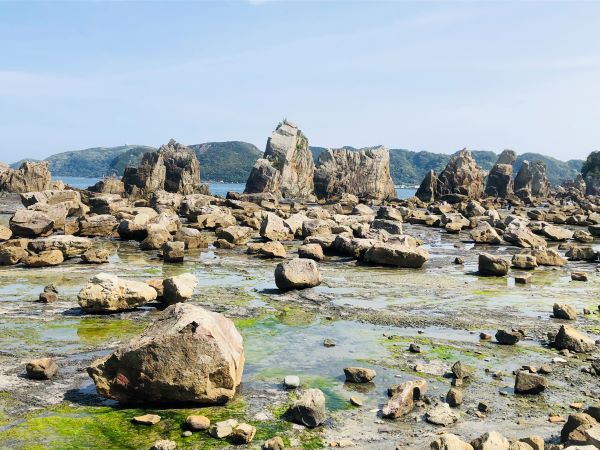 潮岬灯台を後に再び国道42号へ。しばらく進むと海に並ぶ岩が見えてきました。