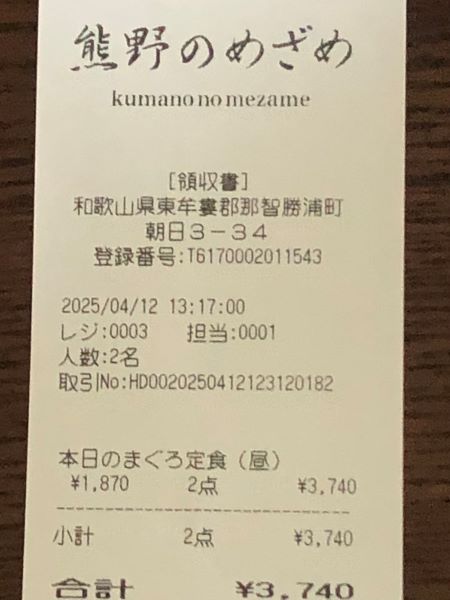 皆さんこんにちは!山陰→近畿車旅シリーズ第10回、今回は「熊野のめざめ」でのプチ贅沢なランチタイムです。那智の滝と熊野大社を楽しんだあとはランチタイム。グーグルマップで検索して口コミ評価が一番高かった「熊野のめざめ」というお店に決めました。ちなみにクチコミ評価のスコアは4.8。4点前半でもなかなかだと思うんですが、4.8はあまり見ないですよね場所はJR紀伊勝浦駅のすぐそば。ナビに従って行くとすぐに見つかりました…が駐車場が分りにくい。お店の前に小っちゃな案内表示があるんですが、その通り行ったつもりでも見つからずウロウロ。結局お店の人に聞いてやっと分った次第です。人気店なのであえて分かりにくくしているのかな?と思ってしまいました。小じんまりして明るい雰囲気の店内はシンプル&モダン。お昼時なので待たないといけないかも?と思っていたんですが、運よく2人のテーブルが空いてすぐに案内されました。注文したのは人気メニュー「本日のまぐろ定食」。お店の人から「団体さんが入ったばかりなので少しお時間がかかるかもしれません」と言われたのですが、それほど待たずに料理が運ばれてきました。写真を撮り忘れたのでこちらのリンクで見てくださいね。内容は文字通りマグロ尽くし。お刺身メインですが色々な食べ方が工夫されています。例えば海苔で巻いたり、タレに付け込んだマグロのヅケ、山芋に混ぜ込んだとろろマグロ、などなど。お値段は税込み1,870円。この内容ならリーズナブル、といかコスパ抜群だと思います。ケチケチ旅行にしては珍しく贅沢なお昼で大満足の後は、ゆっくりと帰路につきます。時間だけはあるのでゆっくり下道を走りながら、高速ワープでは楽しむことができないのんびりドライブ。その模様はまた明日、どうぞお楽しみに