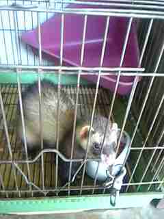 じゅんの仲間(2匹目)をお迎えしたいなと思っていて最近親に話をしたり、お店を見に行ったりしていました。昨日の夜勤明けにふっとじゅんがいたお店に電話をしたらいるということで友達と見に行ってきました。呼ぶとよってきて開けるとゆっくり出てきてさわってみてもおとなしくだかせてくれこのフェレットと思ったのですが家族に連絡が取れずいったんは店を出て帰宅したんです。家に帰って話と写真とったのを見せるとじゃーこれから引き取りに行くという話しになり夜ですが我が家に新しくフェレットがきました。名前は八月に来たとこから「はっちー」ということになりなりました。まだお店にいるときの画像しかないのですが載せます。
