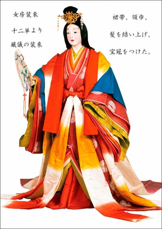 女房の装束が美しく映えて、立派な織物やいろいろな色の唐衣よりも、