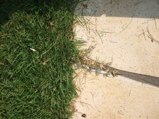 今日も暑かったですね・・・^^;夕方帰ってきた時、あまりの暑さに芝庭に散水約15分肥料焼け予防と打ち水効果を期待してです。そして日曜日の補植の画像です。地上に出てきたTM9の匍匐茎をカット北側の高温障害が出た部分と南側の匍匐茎が伸びてない部分にペグを打ち込みグリグリと穴を広げて空いた穴の部分にカットした匍匐茎を差し込んで目土を入れて散水して終了計14箇所 これからどんなになるでしょうか。