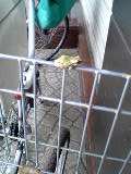 小さいけど・・・分かりますかか・え・る 蛙 ゲロッゲロッ鳴く蛙~~~なして、私の自転車にぃぃぃ~仕事終え買物終え、さあ帰ろうとしたら・・・ひぇぇぇ~~~私いつも某銀行の駐輪場に、私の唯一の足であるを置かして頂いてるのですが、(すいません だけど5回に1回は銀行をちゃんと利用してますです・・・ハイ)買物袋ぶら下げて行くと、行員さんがいる~ しかも私のチャリのすぐ近くに・・・「あちゃ~」と内心ビクビクしながら行くと(けっこうビビリな私)へんなものが見えた・・・買物したもの入れられない・・・固まっているとその行員さんが「あら~どこからきたのかしらね~」と言う。が、まずはでパチリ 「ネタになるかも」な~んて思いながらその私の行動に行員さんもちょっとびっくりしてたみたい。ゲロくんを追い払うことも出来ずとりあえず荷物は後ろの子ども乗せる所に入れ、コワゴワハンドル持ってを押しながら歩き出しました。チャリが動けばどこかにぴょ~~んと行くだろうと思ったんだけど、チャリに乗って走ってる時自分の方に飛んできたら、チャリごと私はひっくり返るだろうと・・・ならば押しながらなら、自分は無事でだけ倒れる・・・と想像してねガタゴト揺れてもゲロくん、しっかり踏ん張ってやがんのすれ違う人、誰も気付いてなさそう~誰か助けて~~~ここに ホラ 蛙がいるのよ~と心で叫びながら、どれくらい歩いたかしらゲロくんは90度向きを変えたり(直視されるとマジで怖かった)、いろいろ向きを変えながらもしがみついたままで・・・とある施設の駐車場に立ってるお兄さん(正確にはおじさん?あえてお兄さんと呼ぶわ)がいました迷わず、「あの~変なことをお願いしたいのですが・・・」「はい?」「そ、そこの蛙を追っ払ってくれませんか」「えっ あ~はいはい」と笑顔で快く応じてくれました何度もお礼を言って、やっとこさを走らせることが出来ました。けど、ゲロくんがいた衝撃が強過ぎて鳥肌はひくこともなく、冷や汗も出たままホントに怖かったよ~~~