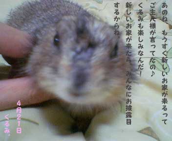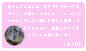 くるみは私が外出から帰ってくると、いつも『ふぎゃー』と鳴きながら立ち上がり自分をアピールします。今日は仕事帰りに寄り道をしまして帰りが遅くなりました、そのせいか帰って来たのにくるみは無反応…お~い、くるみちゃん帰りが遅かったから怒っているのかい?ケージを覗いてみるとくるみはお休み中でした。しばらくしてから私の帰りに気が付いたのか、ケージの中から猛烈アピール。おっくるみちゃん起きたねぇ(笑)なでなでしてあげるよ。今日もご機嫌な、くるみでした。