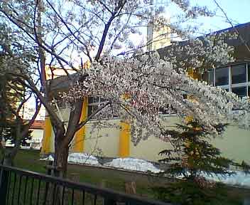 札幌では3,4日前から桜がちらほらと…写真は、自分の家から歩いて5分位の所にある学校に咲いていた桜です。綺麗ですね(*'ー'*)ってあまり綺麗に撮れていないか。。。それと…奥の建物の下を見てみて下さい。なんか白いものが見えました?実はこれ、なんと雪なんですw(゚o゚)w オオー!てか、札幌はまだ雪が残っているのかぁって思った人います?本当はもうほとんど融けてますよ。ただ、この場所が一日中、日の当たらない場所だったんでこんな事が。本当に雪が残っているのは珍しいんですよ(⌒∇⌒)ノ""!! といっても今日の最高気温は13度、夜はまだまだ寒いんです(TωT)