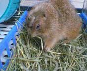 くるみの寝床に敷いているチモシー(草)は、大体週に1,2度新しいものに取り替えます。取り替えると、くるみはいつも草をかみかみしながら自分の寝床をつくります。写真の青い入れ物がくるみの寝床なのですがいつも入れ物の端の方で作業をします。黙々と作業を続けるくるみ。くちいっぱいにチモシーをくわえて、なにやら押したり引いたり。自分に心地よい形を作っているんですね(≡^∇^≡)この後、くるみ姫はとても楽しい夢を見たそうです。