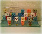 うちの玄関にはこんな物が飾られています。『TO-FU(トーフ)』って言います。右が2人がトーフ親子。赤い方が「お母さんトーフ」青い方は「息子トーフ」です。この親子はいつもドキドキしています、それは、コケると「ペチャ」っとつぶれてしまうのです(;^ω^A だから顔もいつも困っている(*^.^*) ねっ、面白いでしょ。。。僕はトーフが大好きで、このキューブリック(飾ってあるプラスチックの人形)を集めています。まぁ、マニアと言われると否定は出来ないんでしょうね・・・…ちなみに、パチンコ屋さんで『スロット』ととしてもデビューしています。もともとスロット好きで、たまたま「TO-FU2」という台を見て一目惚れしたんですけど(;^ω^A テレテレ下の写真は、「TO-FU2」の後に出た「ECO TO-FU」という台です。 エコトーフのエコはエコロジー、親子がせっせと掃除しています(笑) パネルも(少し見づらいですが…)芽に水を撒いている親子、森林を伐採するポイズントーフキャラクター物の台としては、すごく凝っていました。そういえば、プロフィールの写真は「息子トーフ」のぬいぐるみです。その他にもトーフグッツはまだまだあります。まぁ、また機会があれば(^▽^)/皆さんは何か集めているものってありますか?