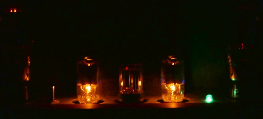 部屋を暗くすると6BL7の大電力ヒーターが目立ちます。