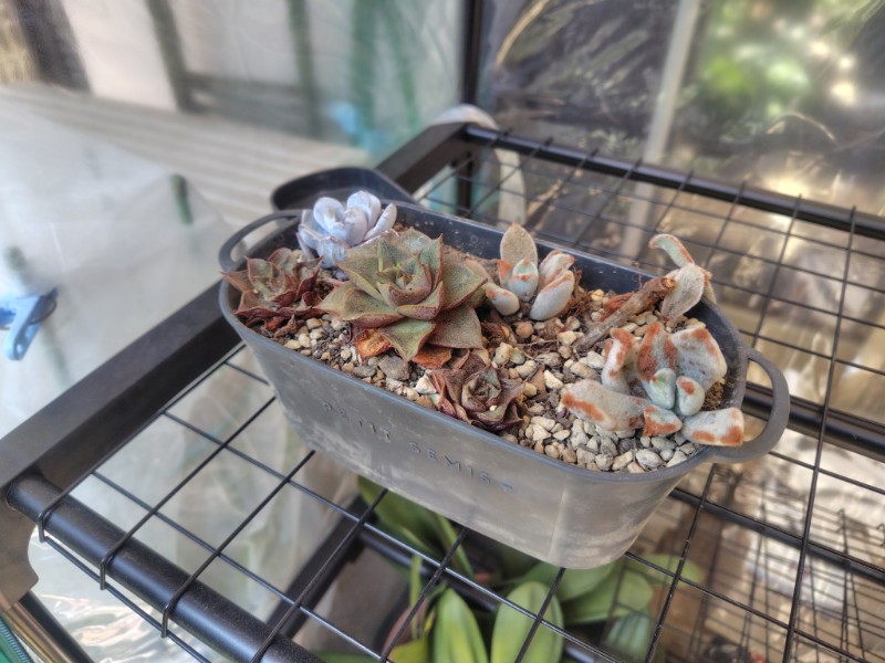 昨年11月から水やりを断っていた多肉エケベリアですが、ビニール温室の中も温度も上がってきたので水やりを再開することにしました。しかし隣にあるはずのダイソー「ルンヨニー」の姿がなく、温室棚を隅々まで探してみると…一番下の段にポットから飛び出た状態で転がっていました。😱幸いノーダメージだったので、先輩たちと合流させました。ついでにダイソー根無し「サンスベリア」にも初めて水やりしました。これから色々と忙しくなりそうです。😄
