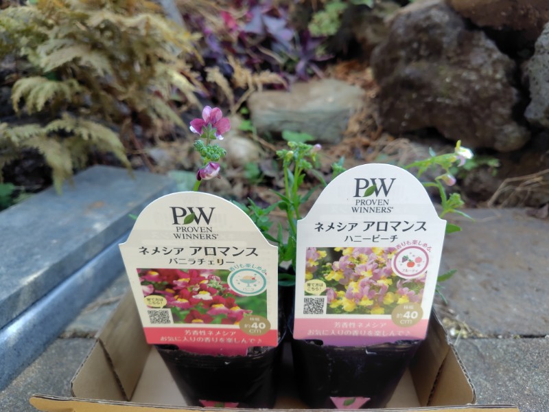 夢よもう一度シリーズで今回10年振りにお迎えしたのはネメシアです。PWアロマンスシリーズ「バニラチェリー」「ハニーピーチ」各348円安心と信頼のPWで芳香性が売りなので入荷したら買おうと狙っていました。かつて植えていた場所は西日が強かったので、今回は西日が当たらない地植えクリロー「ルナネオン」の手前に植え付けました。完璧な苗と完璧な場所を得た今回のネメシアのパフォーマンスに乞うご期待!(うまくいかないことも含めて)😄