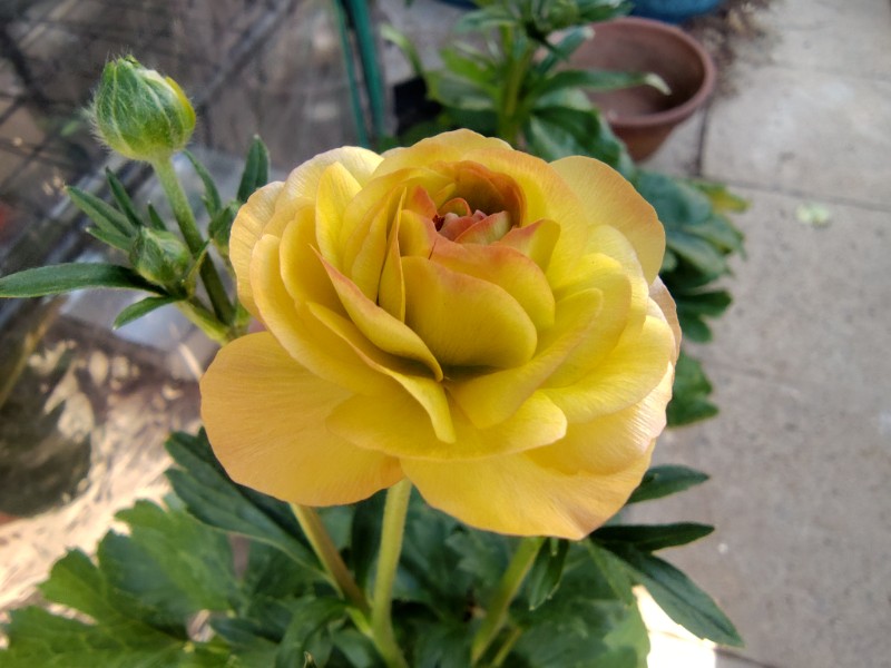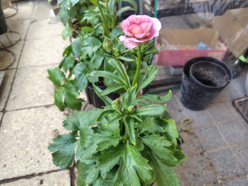 2週間前まで氷点下に備えてビニール温室で管理していたラナンキュラスラックス6株ですが、一気に春の陽気になったので先週から外に出していました。今日は4月並みの陽気とのことで朝から水やりしたかったのですが、先に買い物に出掛けてしまい帰ってくると…アリアドネが水切れをおこしてクタクタになってしまいました。😱開花間近の蕾が台無しに。他の株は大丈夫なのになぜ?とりあえず、たっぷり水やりして祈ること2時間…無事復活して、さらに開花もしてくれました。😄アリアドネの初開花です。🌼今回の水切れ事件は今後のラックス管理の教訓にしたいと思います。