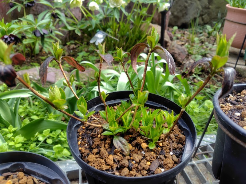 昨年大量に買いまくったアジサイの内、地植えせず鉢植えで管理している4株も芽吹きの季節を迎えました。🌱まずは昨年9月にベビー苗で購入したラグランジア「オーロランジュ」まんべんなく芽吹いており初開花が楽しみです。😄しかし…左から「パリジェンヌ」「スターリットスカイ絢」「ブルーマーブルソーダ」こちらの3株は下葉が沢山出てきたものの、昨年の枝先からは芽吹いておらず、冬の寒さで芽が飛んでしまったようです。😢ということは、旧枝咲きのアジサイなので今年は花無しになるのでしょうか?とりあえず枝は残したまま様子を見てみます。。。