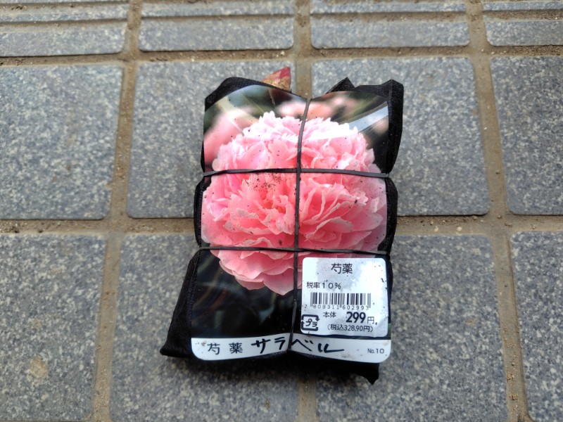 よく行く食品スーパー(今日の東京マラソンで日本人最高順位だった選手の会社)の入口に毎度ゲリラ的に花苗が陳列されるのですが、また面白い物が入荷したので買ってきました。シャクヤク(芍薬)「サラベル(サラベルナール)」お値段、何と299円!シャクヤクについては、8年前に牡丹を枯らした時に「次に育てるなら(冬に地上部が残らない)芍薬がいいな」と思いつつ実現していなかったのですが、この値段なら何も考えずにお買い上げです。帰宅後調べてみると、品種名はフランスの女優「サラ・ベルナール」が由来で芳香性であること、そして…「小さい苗は開花まで2〜3年掛かる場合があること」😖ショックやを隠しきれずゴムバンドをご開帳すると、あぁ、やっぱり。😞唯一の望みは、売られていた他の苗の芽は綿棒程度だったところ、この苗の芽だけ親指大の極太だったので、もしかしたら今年咲くかも…鉢は迷いに迷って「根はり鉢8号」に決定。シャクヤクは水保ち重視かつ肥料喰いらしいので、培養土7:赤玉中粒3にヰセキ有機複合肥料550号、マグァンプK、カーメン君のピンク肥料、発酵油かすを混ぜ込みました。もし今年咲かなくても299円なので気楽に待とうと思います。。。