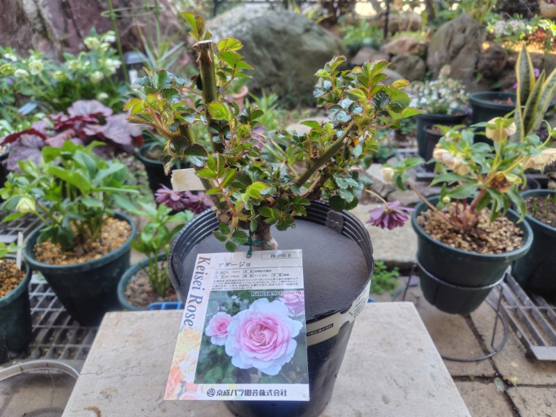 フラワーカーペットローズで久々にバラを復活させたり、「バラもどき」のラナンキュラスラックスを買ったり、クリスマス「ローズ」を買っても満たされない欲望…それは9年前に本格的バラから撤退してしまったからで、やはりガーデニングを趣味とするなら避けては通れない道だと思い直し、HTバラの大苗を買いました。「アダージョ」(独コルデス社作出)2980円ピンクの花色で耐病性に優れ強香で2023年デビューの新しい品種で以前からマークしていたところ、3980円から1000円引きになっていたので決めました。植え付ける鉢はロゼアポット240を用意し、土は完熟堆肥を別途買う手前と天秤にかけた結果、ヰセキの専用土「バラの土」を買いました。すでに新芽が動いており、ポットの中の根も出ているので根鉢は上部のみ解して植え付けました。ついに復活した本格的バラ栽培。恐らく病害虫との闘いもあって大変になると思いますが、それを苦にしないのがバラの魅力なのです。🌹