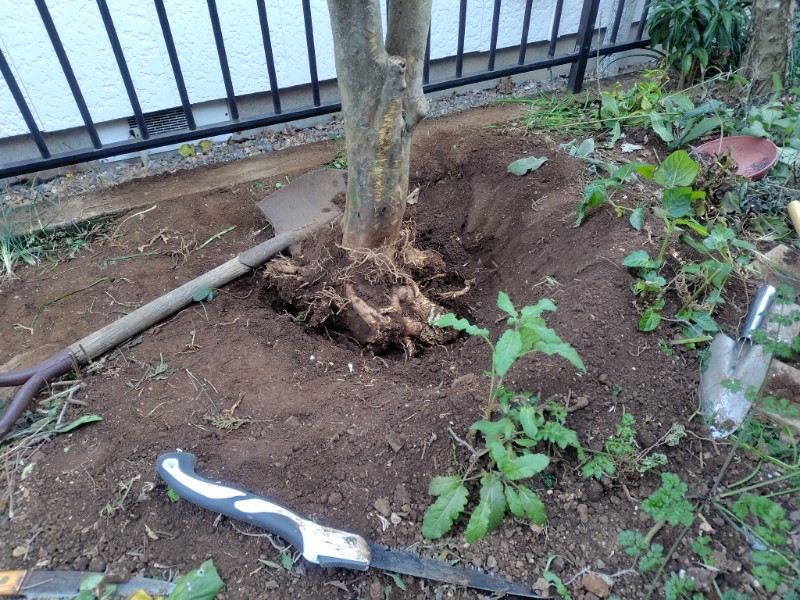 まずは枝を降ろしてから根を掘っていくのですが、この画像の時点で2日目の作業となっています。