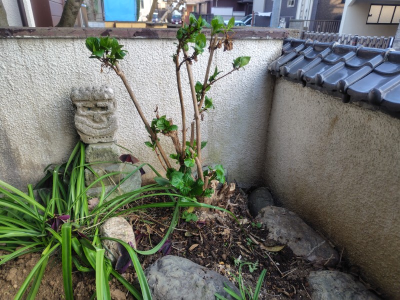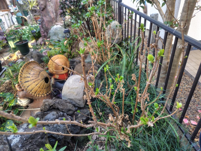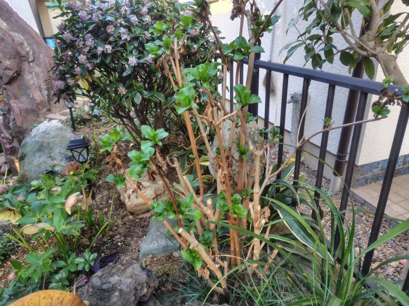 某園芸系ユーチューバーさんが「アジサイの芽が動き出したら枯れ枝を整理しましょう」と言っていたので、我が家の地植えアジサイもメンテナンスしました。