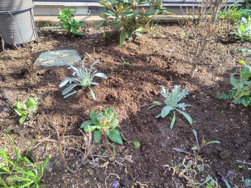 植え付けはお陽さま大好きなガザニアなので、宿根草エリアのど真ん中にセットしましたが、この時期は芽が出ていない「地雷」があちこちに埋まっているので神経を使いました。