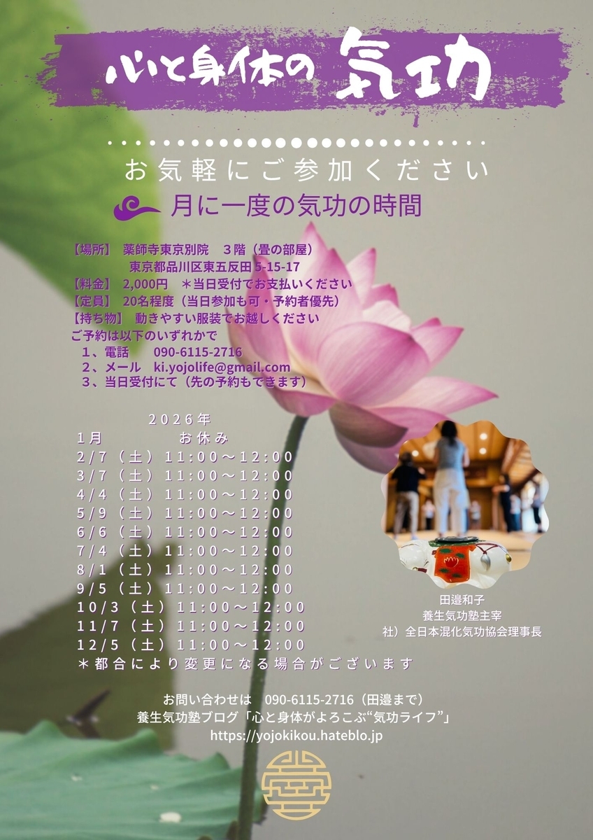 薬師寺東京別院さまで行っている「こころとからだの気功」2026年の開催予定です。 1月は薬師寺はお休みになるので以下の60分クラスでお待ちしています。1月10日(土)田園調布1月24日(土)武蔵小山各10:30~11:302000円/回 2026年の予定1月 お休み2/7(土)11:00~12:003/7(土)11:00~12:004/4(土)11:00~12:005/9(土)11:00~12:00*第2土曜6/6(土)11:00~12:007/4(土)11:00~12:008/1(土)11:00~12:009/5(土)11:00~12:0010/3(土)11:00~12:0011/7(土)11:00~12:0012/5(土)11:00~12:00*都合により変更になる場合がございます 薬師寺東京別院さま東京都品川区東五反田5丁目15番17号三階の和室が会場になります!参加費:2000円(当日払い)参加申込はメールでお願いします。ki.yojolife@gmail.com