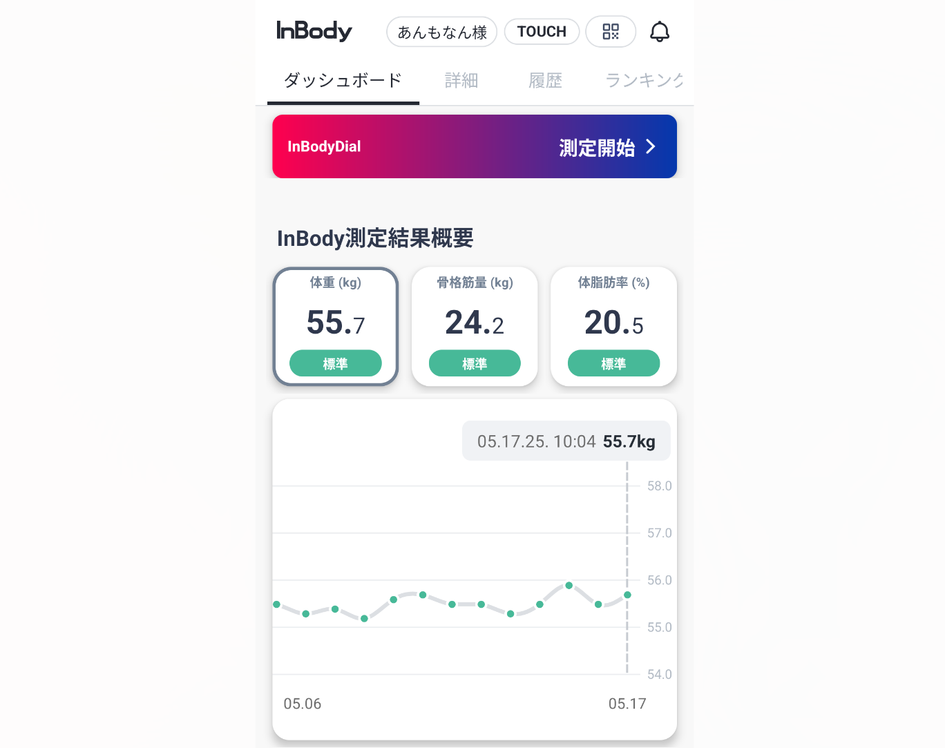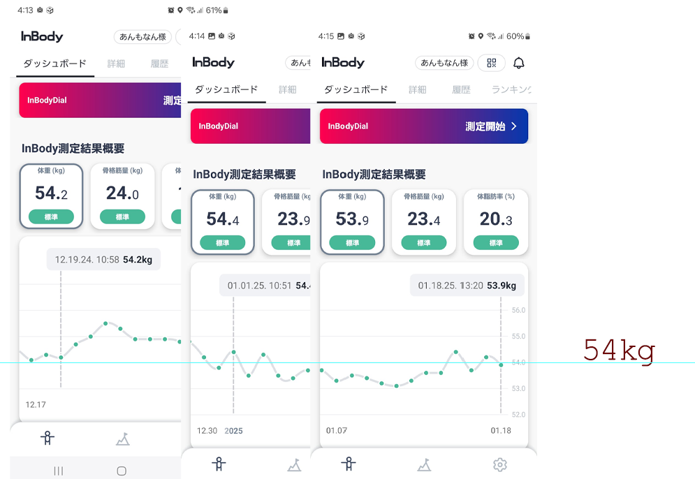 お久しぶりです!あんもなんです!体重は増えていますね……前回からだいぶ経過していますが、比較すると体重 : 54㌔前後 から 56㌔前後体脂肪: 20%前半 から 20%後半みたいな感じ……かな身長は161.5センチで、上の画像の状態だとBMIは20.5です。おかげさまで、やっと足をかばわずに歩けるようになりました。寝起きはやっぱりだめなんだけど、それ以外は。やはりね、「あんまりたくさん歩けない」はデカいな~体重増えるな~と思った。ただ、筋力はそこまで落ちていなくて(落ちないんだね……?)体脂肪も、なんか思ったよりは増えてなかった!とはいえ、ほっぺたのふっくら加減はいまのほうがあって、好きなんです。やはり52キロのときの老け加減は「いまの顔が好き」とはどうしても言えなくて。体重自体は減らさず、筋力を増やしていく感じにしよかな?体調、すごくいいし。今回の体重増は「敢えて増量した」ことにし、40代後半として過ごしやすさと健康を目指していきたいと思います!で、あらためて、インボディを買ってよかったなって思ってます。今回みたいに「体脂肪」までをきちんと考えられないと、やはり気持ちが落ちてたと思う。体重だけで比較してしまうからね。『性別と年齢で調整されない体脂肪率が出せる』これだけで、インボディおすすめです。興味があったら過去記事なども見てみてくださいね。最初の記事が一番わかりやすいかな。2024.10.29ですね体組成計inbodyで測ったら、体脂肪率25%が17%以下だった?私が持ってるのはこれ。えっと、すごいかっこいいんだけど、ちょっとホコリが気になりますwINBODY プレミアム体組成計 ミッドナイトブラック [スマホ管理機能あり] H20Nこちらのほうが一般的。白いの。少しお安く買える。インボディInBody InBodyDial 体組成計 公式 年齢・性別による統計補正(平均化)されずに測定可能 H20N InBodyDial インボディダイアル デジタル 体重計 体脂肪計 アプリ Bluetooth スマホ対応5月は後半にも楽天マラソンがあるので、ぜひ狙ってみてくださいね✨あんもなんでした!X:@anmonan2024