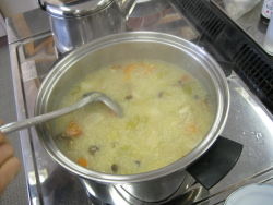 自然食クッキング教室に行って来ました。よく行く自然食品のお店の方に誘われていた料理教室ですが日程が合わず今まで行く事が出来なかったのです。やっと参加出来ました~マジ嬉しい。今回のメニューは、マカロニ・ひえシチューです。野菜たっぷり(干しシメジ、かぶ、にんじん、たまねぎ、きゃべつ、ブロッコリー)干しシメジを戻し、戻し汁と昆布でだしをとります。無農薬の野菜なので、皮を剥かずきれいに洗うだけ。野菜を切って鍋で少量のオリーブオイルで炒め、戻し汁、だしを加えコトコト煮ます。野菜が柔らかくなったら、良く洗ったひえを入れ、20~30分弱火で煮ます。時々混ぜないと底にこびり付くので注意しながら、さらさらだったスープは、とろっとしたシチューになりました。塩で味を調え、好みでコショウを加える。茹でたマカロニにシチューをかけて出来上がり~。かなりのボリューム! サラダは、レンコンとかぼちゃを蒸して、戻しワカメ、フノリを醤油、梅酢、水のドレッシングで合えました。ワカメ、フノノリが磯の香り~Goodなかなかさっぱり! ご飯はいつもは玄米ですが~今回は3分づきのお米と雑穀のご飯でした。なんともシンプル! 食べながら次回のリクエスト料理など~話ながら~皆が、お野菜大好き、とても食の安全を大切に考えている事が伝わって~なんとも暖かな気持ちになりました。