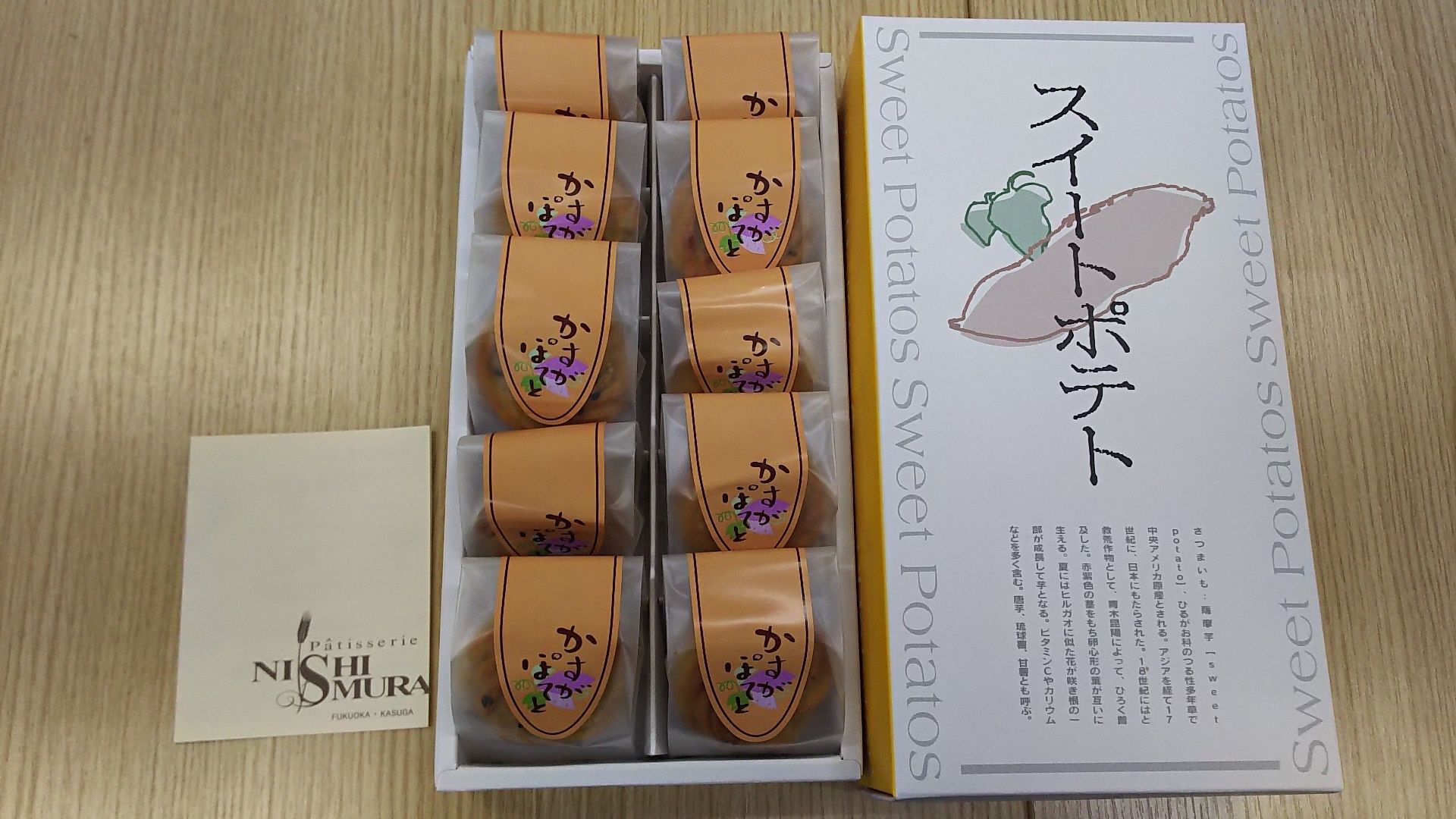 職場に差し入れがございました福岡市春日市にありますパティスリーニシムラってところのお菓子でございます頂いたお菓子には地元かすが(春日)って名前が振ってある…とぅーすってコトは なのかな最近、お芋のスイーツってよく見かけます…流行りなのでしょうかぶっちゃけ言いますと芋をあまりリスペクトしていないワタクシ。周囲の甘くて美味しそう発言に空気感だけ合わせまして1個頂きました包みを開けますとほわんっと香りが…頂きます昨今のお芋スイーツは、最大限に芋の甘さを引き出しました的なウリをしているよーな気がしますが、このスイーツは優しい甘さ…振りかけてある胡麻もアクセント美味しゅうございますっごっつぁんでしたっ