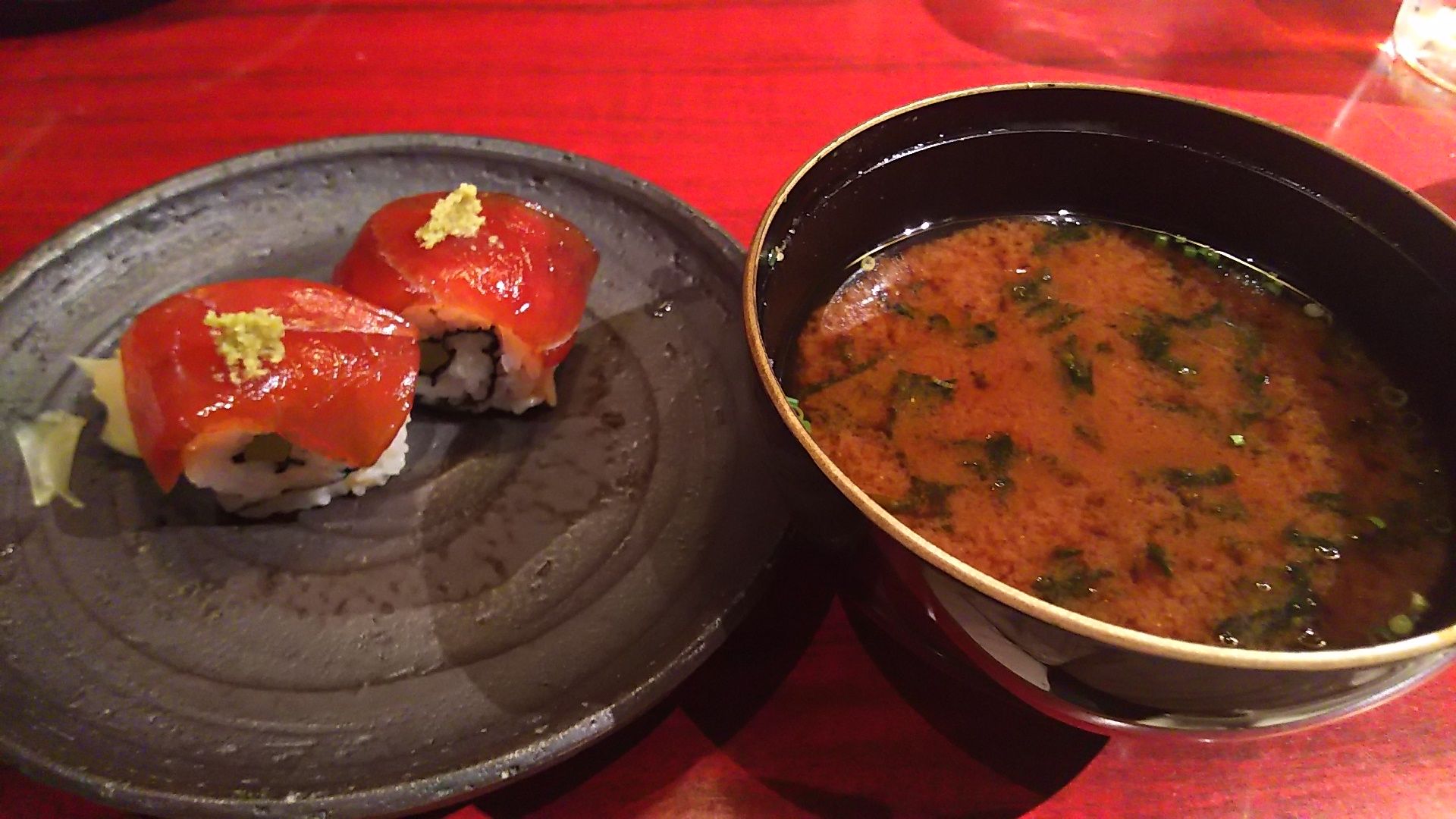 〆は赤だしの御味噌汁にこれまたマグロの赤身の創作寿司…赤づくしとお洒落にまとめましてコースは終了です