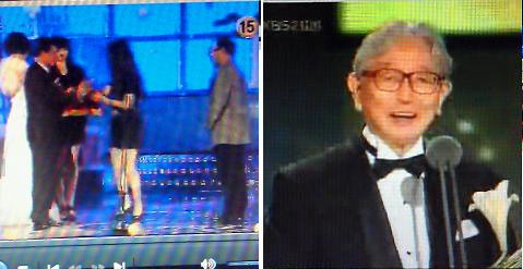 昨日は子供も旦那も帰宅時間が遅かったので途中からでしたが授賞式を観ることが出来ました。PCの小さな画面でときどきフリーズする画面をなだめながら・・・「男の物語」が長編部門で最優秀賞となり監督がギョンテくん(ギウン君ですね)と抱き合うシーンを観て一瞬去年年末のヨンハ受賞シーンを思い出していました。本当におめでとうございます^^視聴率ではなく中身で選ばれたんですよね。そういえば「風の絵師」のムン・グニョンさんが昨年SBS演技大賞を受賞した際も、視聴率ではなく演技力そのもので選ばれたいう記憶があります。昨日の表彰式を観た韓国の方々が「男の物語」に関心を持ち観ていただける人が増えたらいいなと思いました。・・・で携帯で取った画面。とっても汚いですがアップします。いま観ている「一枝梅」の主題歌「花信」がヒョシン君の歌声と知りサイワールドで検索したら、たくさんのドラマ主題歌を歌っているんですね。ヨンハのお友達ということもあり、なんだか他人のような気がしない^^; 上の写真はユン監督と久米明さんです。優秀演技賞を受賞された久米さんはいろいろなドキュメンタリーのナレーションをされていますが演技者としても素晴らしい方ですね。 久米さんの受賞決定で登壇挨拶を見ながら、ヨンハはこんな凄い俳優さんと同じ土俵に乗り肩を並べていたんだ、と改めてヨンハのファンとして誇らしかったです。