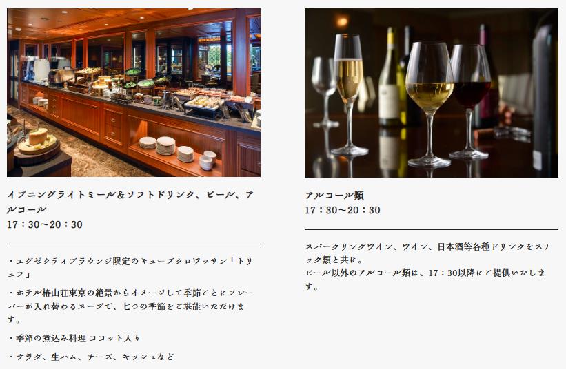スパー「憩」でリラックスした後は、夕食前の食前酒?少し前に「スイーツ&セイボリー」を楽しんだラウンジへ向かいます。この時間帯は、魅力的なフードが目白押しの「イブニング・ライトミール」(17:30~20:30)に衣替えです。謳い文句は、ディナー前の軽食となっていますが、魅力的なフードとアルコールを一緒にいただける満足度の高い内容となっています。冷製メニューは、自家製ハム、サラミ、エスカベッシュ、スモークサーモン、チーズ、ドライフルーツ、ナッツなどが並んでいます。温製メニューは、季節のグリル野菜などがあります。この時間帯からアルコールは、 スイーツ&セイボリーから登場しているビールに加え、赤・白ワイン、等をいただくことが出来ます。その他、ウイスキーやスピリッツ、リキュールなどが用意されています。折角なので、シャンパン・・・いや、スパークリングワインで乾杯!!。セルフですが、飲み放題です。エグゼクティブラウンジ「ル・シエル」を満喫!より充実したホテルステイを実現です。【今日のLifeHack:一生懸命生きている人に人生は輝く、石川洋】<夕方・夜><ラウンジが利用できるお部屋・・・ビューバススイートも><ズラリと並び、目移りしてしまう><スパークリングワイン><支配人お勧めの絶品、蟹のビスク><乾杯!!>