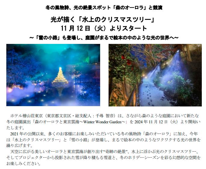 奈良菊水楼「うな菊」でウナギをいただいた後は、庭園散策です。今年は、冬の風物詩、光の絶景スポット「森のオーロラ」と競演で、光が描く「水上のクリスマスツリー」と、プロジェクターから投影された雪が地面に降り積もっていく「雪の小路 ~Crystal Snow Path~」が展開されています。楽しみです。時間限定の為、タイミングが難しいのですが、なんとか見ることが出来ました。「雪の小路 ~Crystal Snow Path~」は、春に見た「桜」同様、素晴らしいデキでした。・・・「水上のクリスマスツリー」は、スクリーンとなる霧の出し方や、その時の風の影響もあるのでしょうが、もう一つ・・・・・・・・・・・・・・・・・・・・・・・・・・・・・・・・・・・・・・・・・・・<■冬の風物詩、光の絶景スポット「森のオーロラ」と競演>(光が描く「水上のクリスマスツリー」) 11 月 12 日(火)よりスタート ~「雪の小路」も登場し、庭園がまるで絵本の中のような光の世界へ~ ホテル椿山荘東京(東京都文京区・総支配人:千尋 智彦)は、さながら森のような庭園において新たな冬の庭園演出「森のオーロラと東京雲海~Winter Wonder Garden~」を 2024 年 11 月 12 日(火)から開始。2021 年の公開以来、多くのお客様にお楽しみいただいている冬の風物詩「森のオーロラ」に加え、今年は「水上のクリスマスツリー」と「雪の小路」が登場し、まるで絵本の中のようなワクワクする光の世界を繰り広げます。天空に広がる美しいオーロラと東京雲海が創り出す“奇跡の絶景”、水上に浮かぶ光のクリスマスツリー、そしてプロジェクターから投影された雪が降り積もる雪道と、冬のホリデーシーズンを彩る幻想的な空間をお楽しみください。◇冬の光の絶景スポットに「水上のクリスマスツリー」が登場当ホテルの庭園では、「椿」「桜」「新緑」「蛍」「涼夏・深緑」「秋」「冬」の 7 つの季節のうつろいに合わせて自然の絶景と各種庭園演出をお楽しみいただいております。「水上のクリスマスツリー」は、2024 年冬、初登場の庭園演出です。東京雲海を発生させる霧のノズルを空に向かって噴射することで、庭園内の幽翠池の上に霧状の「雲海スクリーン」(タテ約 6m×ヨコ約8m)を作りだし、映像を投影いたします。森のオーロラ、東京雲海とともに水上に現れるスクリーンに、輝く光がクリスマスツリーを描きはじめます。グリーンやゴールドの光が数パターンのクリスマスツリーを描き出し、心躍るクリスマスの幻想的な景色をご覧いただきます。「森のオーロラ」は、光量の異なる光を組み合わせ、6 方向から 6 層に重なる光を組み合わせることによって、オーロラの持つ複数の色のグラデーションを表現。空を覆うように光が広がる没入感のある空間は、一方向だけでなく頭上にまんべんなく出現するオーロラの特徴を再現しています。風や気象条件によって「雲海スクリーン」の形状やオーロラのグラデーションも変わるため、日々異なる景色をお楽しみいただけます。◇「雪の小路 ~Crystal Snow Path~」や閉園後の庭園でオーロラを堪能できるステイプランが登場!森のオーロラと同じ期間で、庭園内の水車から御神木へ向かう小路に、プロジェクターから投影された雪が地面に降り積もっていく「雪の小路 ~Crystal Snow Path~」も開催。椿山(つばきやま)側の斜面にはレーザーで雪が舞っている様子を映し出し、足跡や雪だるまも現れ、心弾む雪景色をお楽しみいただけます。また、ステイプランでは、閉園後の 23 時以降に 1 日 6 組限定で庭園にご案内し、オーロラと水上のクリスマスツリーの絶景を独り占めできる特別プランが登場。ホテルオリジナルタンブラーに入ったホットドリンクとリクライニングチェアをご用意しますので、ゆったりとした気分の中でご観賞いただけます。メインバー「ル・マーキー」、ショップ「セレクションズ」ではオーロラをイメージしたカクテルやデザートもご提供しているので、庭園の演出や景色と併せて、一緒にお楽しみください。 ・・・・・・・・・・・・・・・・・・・・・・・・・・・・・・・・・・・・・・・・【今日のLifeHack:人生はいつもそう。悪いことさえしなければ、必ずいつか良いことが起きる、元谷芙美子】<路を歩いてみると・・・><Happy Winter><東京雲海の開始!・・モクモク・・・><クリスマスツリー・・・もう一つ!><部屋に戻って、ビューバススイートの窓から庭園を・・・>