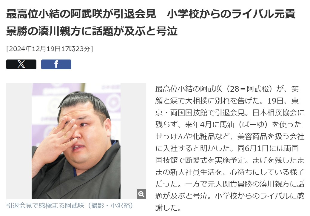 阿武咲関引退のニュースが流れ、驚かされました。身体の不調は知っていましたが、引退するほど体が悲鳴をあげているとは知りませんでした。残念ですが、仕方がありません。お疲れ様でした。2017年から始まったツーショットの撮影、何度もお願いして、快く引き受けて頂いたのを懐かしく思い出されます。身体を本調子に戻し、次のステップに進めれることを期待致しております。・・・・・・・・・・・・・・・・・・・・・・・・・・・・・・・・・・・・・・・・<■最高位小結の阿武咲が引退会見 小学校からのライバル元貴景勝の湊川親方に話題が及ぶと号泣>[2024/12/19]最高位小結の阿武咲(28=阿武松)が、笑顔と涙で大相撲に別れを告げた。19日、東京・両国国技館で引退会見。日本相撲協会に残らず、来年4月に馬油(ばーゆ)を使ったせっけんや化粧品など、美容商品を扱う会社に入社すると明かした。同6月1日には両国国技館で断髪式を実施予定。まげを残したままの新入社員生活を、心待ちにしている様子だった。一方で元大関貴景勝の湊川親方に話題が及ぶと号泣。小学校からのライバルに感謝した。みるみるうちに顔が紅潮し、涙があふれ出た。阿武咲は小学校のころからのライバル、元貴景勝の湊川親方に引退の報告をしたか問われると「はい」と即答。続けて「今まではお互い現役中で、素直な気持ちを言えなかったけど『本当にありがとう』と。同じ時代に生きられてよかった」と話し、大粒の涙を何度もぬぐった。湊川親方からは「オレら頑張ったよな」と、電話口で返されたといい「うれしかった」と、1場所早い秋場所で引退した、盟友のねぎらいに感謝した。青森の打越(うてつ=阿武咲の本名)と、兵庫の佐藤(湊川親方の本名)といえば、小学生のころから全国に名前が通っていた。ともに96年度生まれの同級生が、幕内優勝を懸けて23年初場所13日目に対戦したのが、現役生活で最も思い出深い一番。「昔から知っている間柄で、最高峰の舞台で優勝争い。一緒に頑張ってきた仲だったので特別。もちろん負けたくなかったけど、うれしかった。死ぬまでの財産。本当に幸せな相撲人生だった」。敗れたが「全てを出し尽くした」という最高の取組だった。「(湊川親方とは)同じような体格だし、ここが限界だったのかもしれない」と、ともに慢性化したケガの影響で、同じ年に土俵を下りる決断をした。阿武咲は古傷の右足首や右膝の痛みに加え、夏場所で両肩を痛め、持ち前の突き、押しはもちろん、おっつけも力が入らなくなった。「阿武咲の相撲ではない。相撲を取れる体ではなくなった」と引退に迷いはなかった。今後は将来的な独立も視野に、馬油を使った美容商品を扱う会社に入社する。「自分自身、肌が弱くて馬油に助けられたので、同じように困っている人の力になれば。家族がいるから頑張らないと。新しい生活が楽しみ」。第2の人生も、夫人と3人の子どもを引っ張っていく決意。最後は晴れやかな笑顔で相撲界に別れを告げた。【高田文太】・・・・・・・・・・・・・・・・・・・・・・・・・・・・・・・・・・・・・・・・【今日のLifeHack:しょぼくれて生きるには人生は短すぎる、小池一夫】