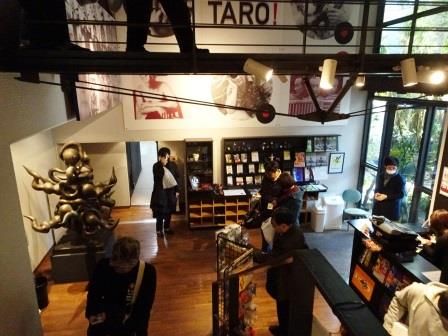 この建物は、近年、各国の建築群が世界遺産に登録されたル・コルビュジエの弟子だった建築家・坂倉準三さんの設計だと言います。屋根は個性的ですが、奇抜な岡本太郎とは思えない地味な建物で、カフェの看板の方が目立ちます。