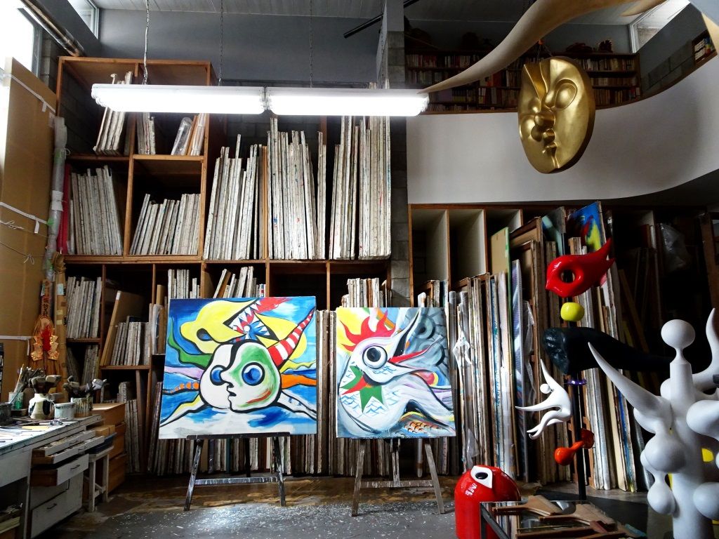 奥の部屋は数多くのキャンバスが壁一面に納められ、見上げた2Fには本がびっしり並んでいて、芸術家の仕事場という雰囲気です。机上には沢山の筆や刷毛や絵具が乱雑に並んでいます。