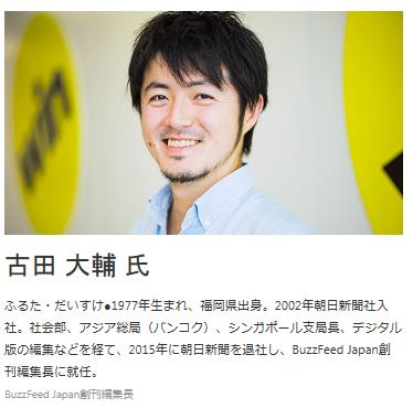 ふるた・だいすけ●1977年生まれ、福岡県出身。2002年朝日新聞社入社。社会部、アジア総局(バンコク)、シンガポール支局長、デジタル版の編集などを経て、2015年に朝日新聞を退社し、BuzzFeed Japan創刊編集長に就任。
