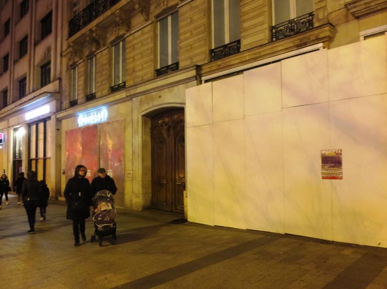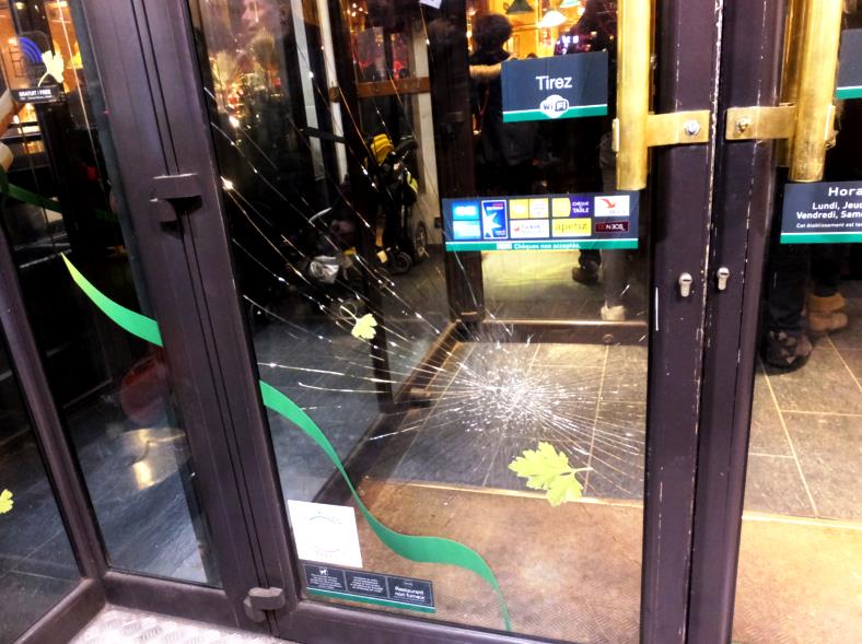 シャンゼリゼ通りの多くの店が暴動の被害を受けていて、このレオンも例外ではなく、通りに面した入口のドア・ガラスの一部にヒビが入った傷跡が残っています。