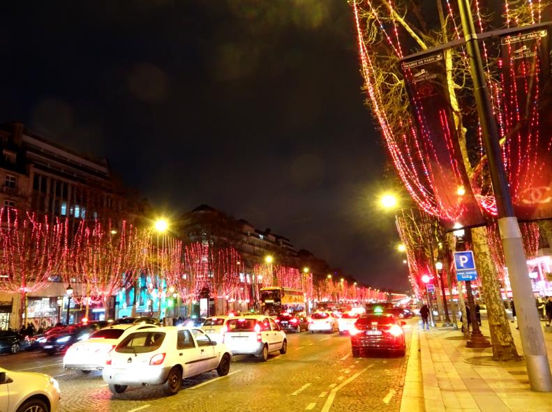赤いイルミネーションに飾られた街路樹の中、夜のシャンデリゼ通りを歩くのもいいものです。