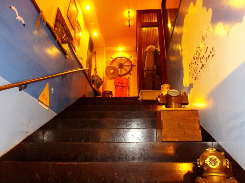 階段を上ると、潜水服など漁師の名に相応しい品々が飾ってあります。