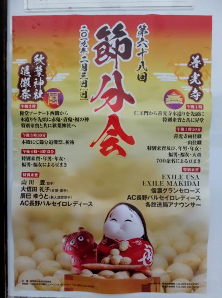 境内を歩いていると、ここ善光寺と近くの秋葉神社で開催される「第68回 節分会」のポスターを見つけました。