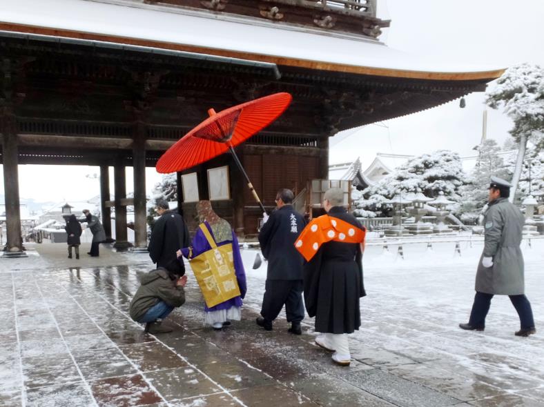 善光寺の本堂では一年を通して数多くの法要が営まれます。「お朝事」といわれる「御朝事法要」はお寺の朝の勤行に当たりますので毎朝行われます。これらの法要には、善光寺住職である大勧進のお貫主さまと大本願のお上人さま、または副住職さまがお導師として本堂においでになります。その本堂への往復の道中、参拝の方々が参道にしゃがんでおりますと、お貫主さまでもお上人さまでも、必ず手にされた数珠で皆様の頭にお触れになり、ご自分の功徳をお分け下さいます。この所作を善光寺では「お数珠頂戴」と申します。
