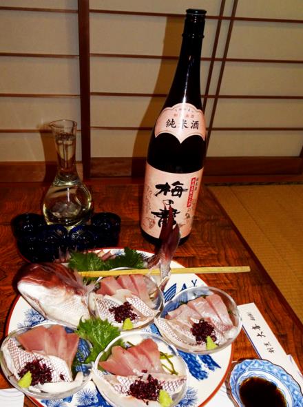 <「梅の舞 純米酒 登録店限定之酒」と鯛のお造り>