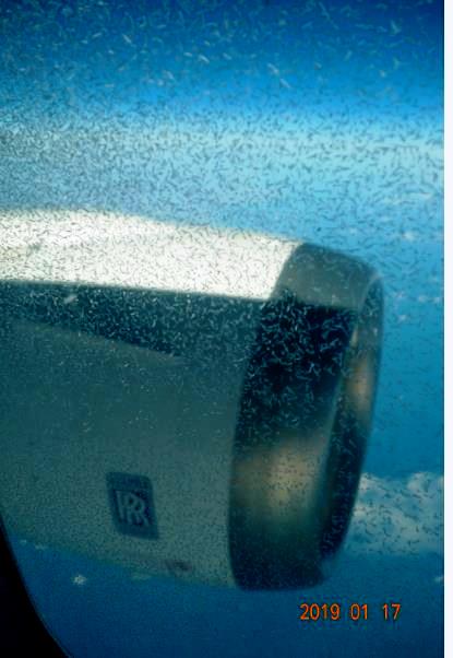 <機内の席を移動して窓際からロールス・ロイスのマークを撮影>