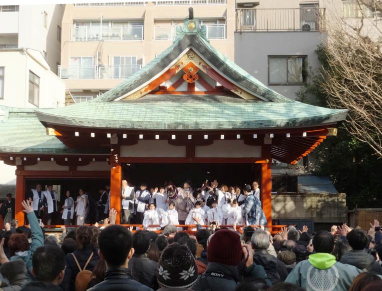 仕方がないので、隣の「浅草神社」の豆撒きを見ながら遠回りして、舞台の右手の最前列を確保します。