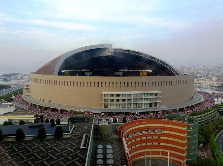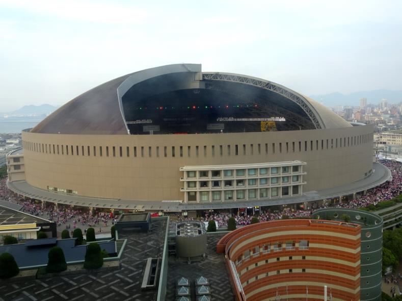 この日のお宿「ヒルトン福岡シーホーク」でひと休みし、明るいうちに出掛けようかと思っていると、ヤフオクドームの周りがピンク一色になり、驚かされました。