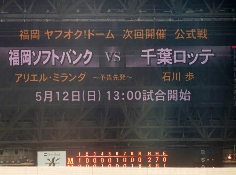 再び、窓の外を見ると、ヤフオクドームの天井が開いていて、スコアボードの上半分が見えます。
