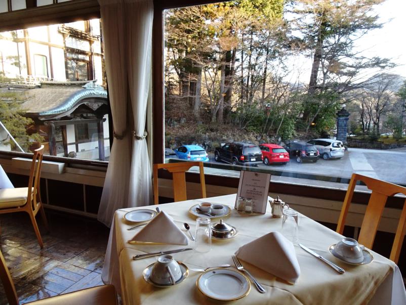 大きな窓から我々が泊まっている「別館」や中庭を眺めながら食事が楽しめます。