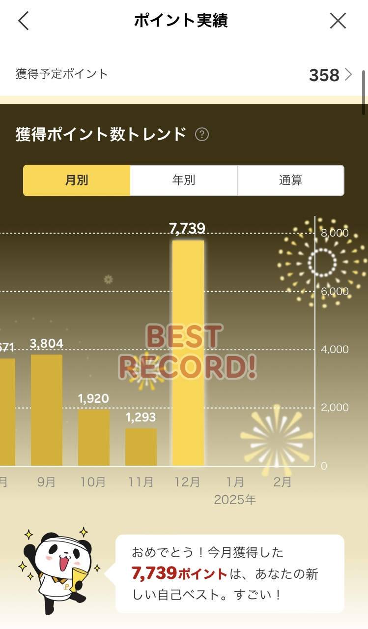 また、12月に、楽天ポイントが7743ポイント!、ベストスコアが出たようです。