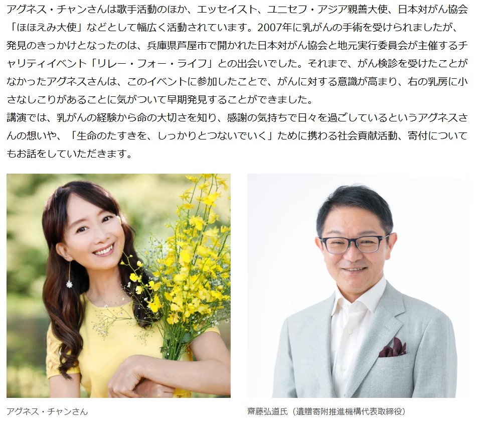 講演では、乳がんの経験から命の大切さを知り、感謝の気持ちで日々を過ごしているというアグネスさんの想いや、「生命のたすきを、しっかりとつないでいく」ために携わる社会貢献活動、寄付についてもお話をしていただきます。