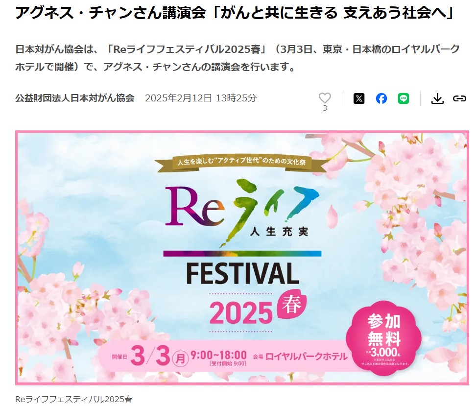 日本対がん協会は、「Reライフフェスティバル2025春」(3月3日、東京・日本橋のロイヤルパークホテルで開催)で、アグネス・チャンさんの講演会を行います。