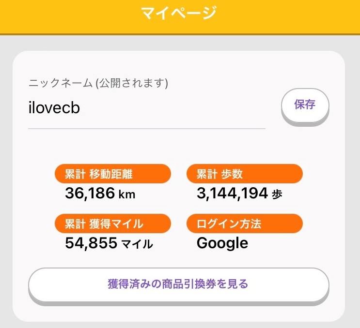スマホの位置ゲー?「トリマ」で、歩いて、歩いて、累計移動距離が、38,186km、累計歩数が、3,144,194歩、累計獲得マイルが54,855マイル・・・やっと、やっと、商品と交換です。